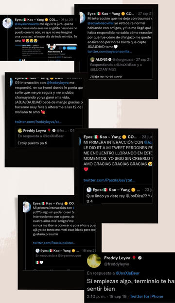 estoy activa pero quedo a veces en flop twitteo puras cosas de mis fav o cosas sin sentido. cuando les tiran salgo a defender no me tiembla la mano me desconozco cuando les tiran, ayudo a limpiar búsquedas. depende del día ando en bardos habló y les lloró a coreanos, un hawaiano, y dos estadounidenses y dos chinos qué de mi propia vida. les lloró a dos bandas uno disbandada y otra en hiatus.